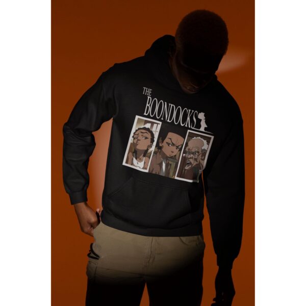 Step into the world of The Boondocks with this striking apparel showcasing the unmistakable faces of Huey, Riley, and Granddad. Perfect for fans of the show, the design captures the series' essence with a bold layout and vibrant colors. Whether as a cozy hoodie or a classic tee, it's a statement piece for your wardrobe.