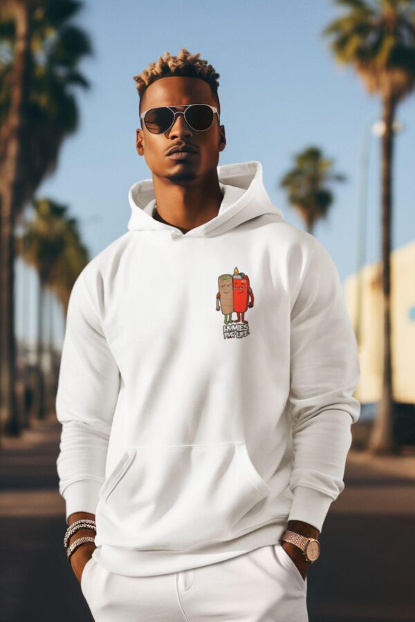 This design speaks to camaraderie as two animated characters, one a blunt and the other a lighter, share a bond on the back of this hoodie or tee. Comfortable and playful, it’s more than clothing—it’s a statement for those who appreciate humor and a laid-back vibe.