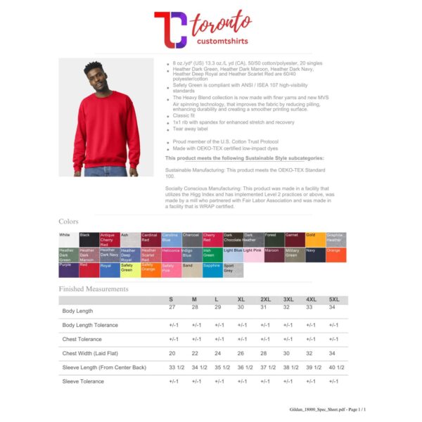 | Primary color | White, Black, Antique Cherry Red, Ash, Cardinal Red, Carolina Blue, Charcoal, Cherry Red, Dark Chocolate, Dark Heather, Forest, Garnet, Gold, Graphite Heather, Heather Dark Green, Heather Dark Maroon, Heather Dark Navy, Heather Deep Royal, Heather Scarlet Red, Heliconia, Indigo Blue, Irish Green, Light Blue, Light Pink, Maroon, Military Green, Navy, Orange, Purple, Red, Royal, Safety Green, Safety Orange, Safety Pink, Sand, Sapphire, Sport Grey |