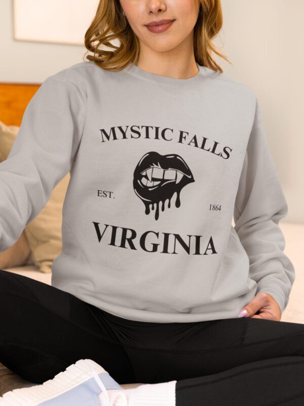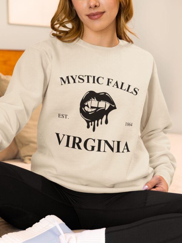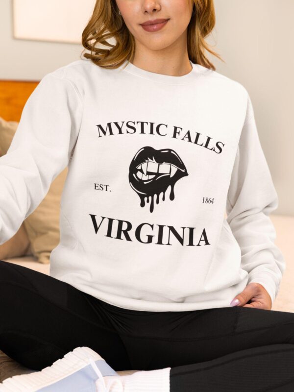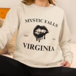 Bring some bite to your closet with this gothic Mystic Falls, Virginia crewneck sweatshirt, designed for every Vampire Diaries fan who still dreams of Salvatore brothers and moonlit drama.