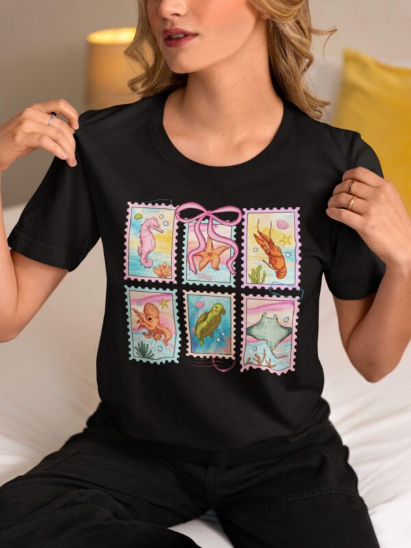 Dive into the whimsical world of underwater creatures with this charming graphic T-shirt. Featuring a delightful postage stamp design, it captures the beauty of marine life with playful colors and intricate details. The soft cotton fabric ensures comfort, while the versatile fit makes it a standout piece for casual days.